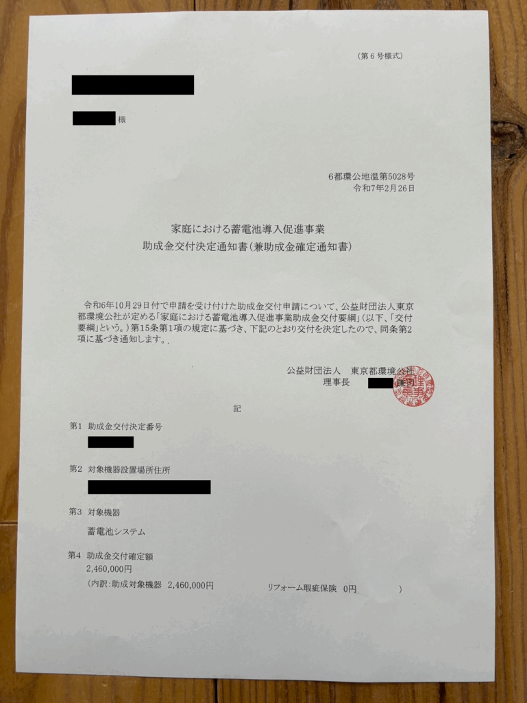 工事が終わったら、交付決定通知が届きます。2か月ほどすると申請の時に指定した口座に振り込まれていました。